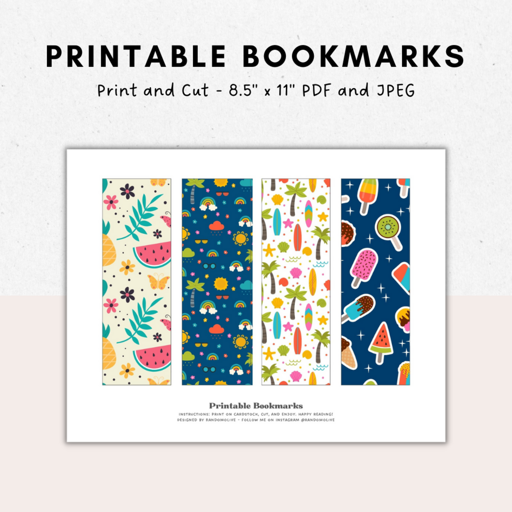 Printable bookmarks, sized 6 inches by 2 inches. Four per page on 8.5" x 11" paper. Print on cardstock and cut out.